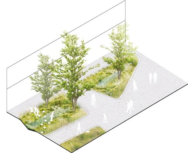 Het groene binnengebied trekt nieuwe verbindingen voor wandelaars en fietsers en laat daarnaast zoveel mogelijk plaats voor groen. Het park nodigt ook volop uit tot ontspannen en ontdekken: “In het park brengen we zoveel mogelijk groen op doordachte manieren. Zo liggen de grasvlakken bijvoorbeeld in verschillende hellingsgraden, wat het park levendiger zal maken maar ook uitnodigt om te gaan liggen, te spelen of tegen aan te leunen. Heel wat bomen brengen schaal en schaduw in het park, met onder de bomen zones met bloeiende