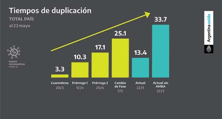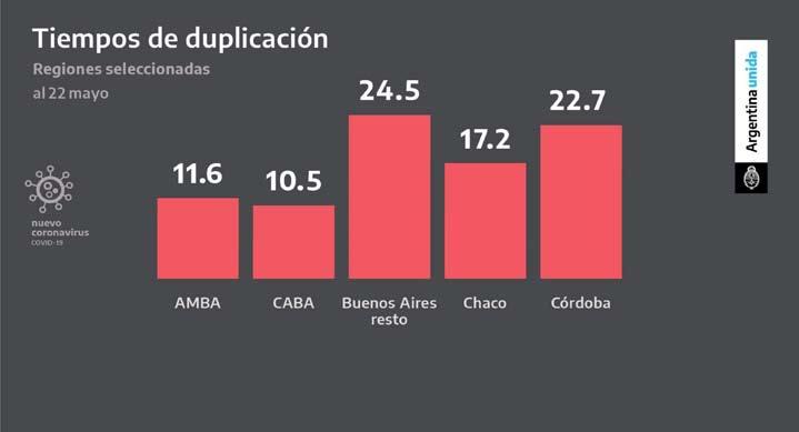 A.G.: Los datos presentados por distintas estadísticas muestran una duplicación cada 13,4 promedio del país. Sin embargo, sacando AMBA, en el país los días de duplicación pasaría a ser de 33.7; para AMBA se encuentra, actualmente, en el 11.6. Esto justifica que AMBA siga con la cuarentena más estricta y sea manejado de manera distinta.