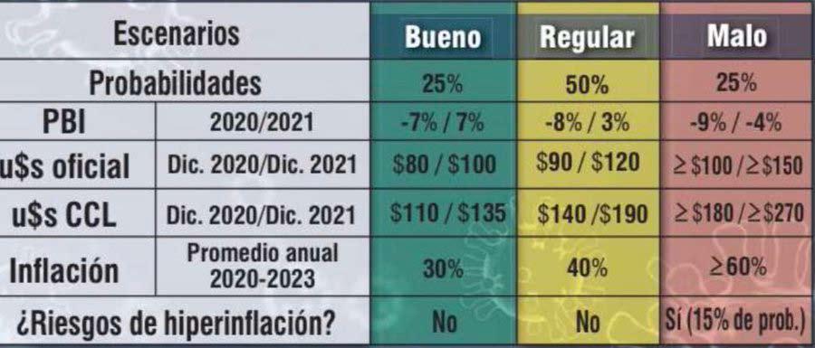 A.G.: Hacer crecer el sistema de salud sobre todo en el norte de la Argentina puede ser el disparador para levantar a un país que puede perder mucho de su producto bruto y necesita crecer. Según Gabriel Rubinstein, economista, hay tres escenarios probables: un escenario bueno desde lo económico, uno regular y uno malo. Él cree que el más probable para la Argentina es el escenario regular, esperemos que no vaya más allá.. La caída en este año estaría prevista, según el escenario, entre el 7 y 9 % del PBI y con una inflación entre 30, 40 o más de 60%. No obstante, Rubinstein dice que el riesgo de una hiperinflación es muy bajo, pero todo va a depender de cuánto tiempo más dure todo esto y cómo se pueda