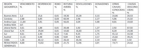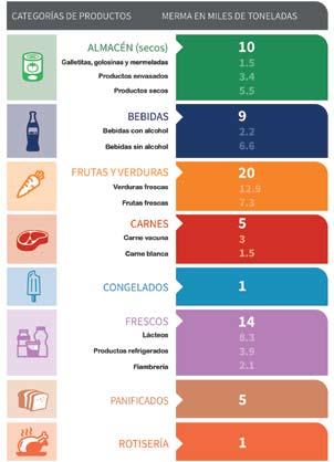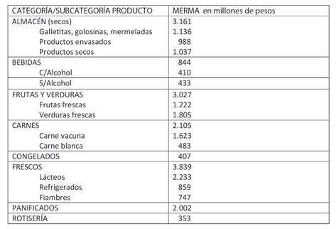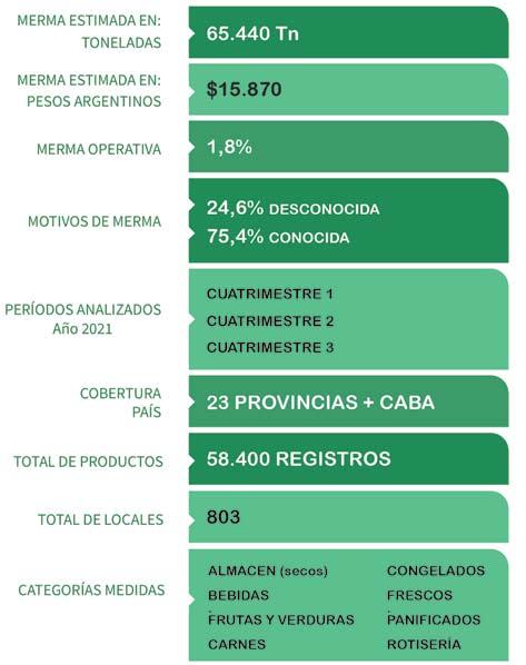 Se identificaron 64.400 toneladas de merma, valorizada en $15.870 millones de pesos argentinos, para el total del mercado analizado. Se observó un alto porcentaje de motivos conocidos para la misma, en 75,4%. Las categorías identificadas con mayor magnitud de mermas