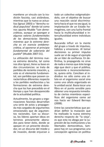 todo un colectivo estigmatizándolo, con el objetivo de buscar una reacción social discriminatoria hacia el que no sea igual, la implantación de un Estado homogéneo, con una lucha frontal hacia la multiculturalidad e interculturalidad entre individuos iguales. Buscando influir en la mente del grupo a través de impulsos, hábitos y emociones. Al tomar decisiones su primer impulso suele ser el de seguir el ejemplo de un líder de confianza. En definitiva, la propaganda no sirve de nada a menos que éste tenga algo que decir y que el público, consciente o inconscientemente, quiera oírlo. Conciben al individuo no sólo como una célula en el organismo social sino como una célula organizada en la unidad social. Basta tocar una fibra en el punto sensible para obtener una respuesta inmediata de ciertos miembros específicos del organismo como así nos hacía ver Edward Bernays (2008). Entre las características que podrían definir la mutación que ha realizado la nueva extrema derecha respecto de “la vieja”, es que esta no aboga por la supresión de las instituciones y las libertades democráticas, tampoco hay en sus programas una concepción agresiva en política 53