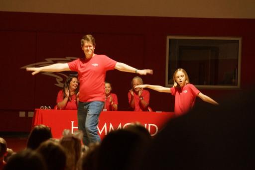 Pajama Day was necessary to start the week, and our Hammond community showed out. Most notable was the AP European History class of the 2022-23 school year, who showed up in their customized Mr. Franke tshirts; of course, Mr. Franke was matching. Oversized nightgowns and slippers seemed to be a theme, yet Mr. Rice (Freshman Biology) and Mr. Hillard (Director of Student Activities) set the standard and impressed in their onesies. Monday’s assembly also featured a Skyhawk Cup challenge. The grades and faculty battled in a serious game of “Head, Shoulders, Knees, Cup!” with senior Elle Brewer coming out victorious over Mr. Rice.