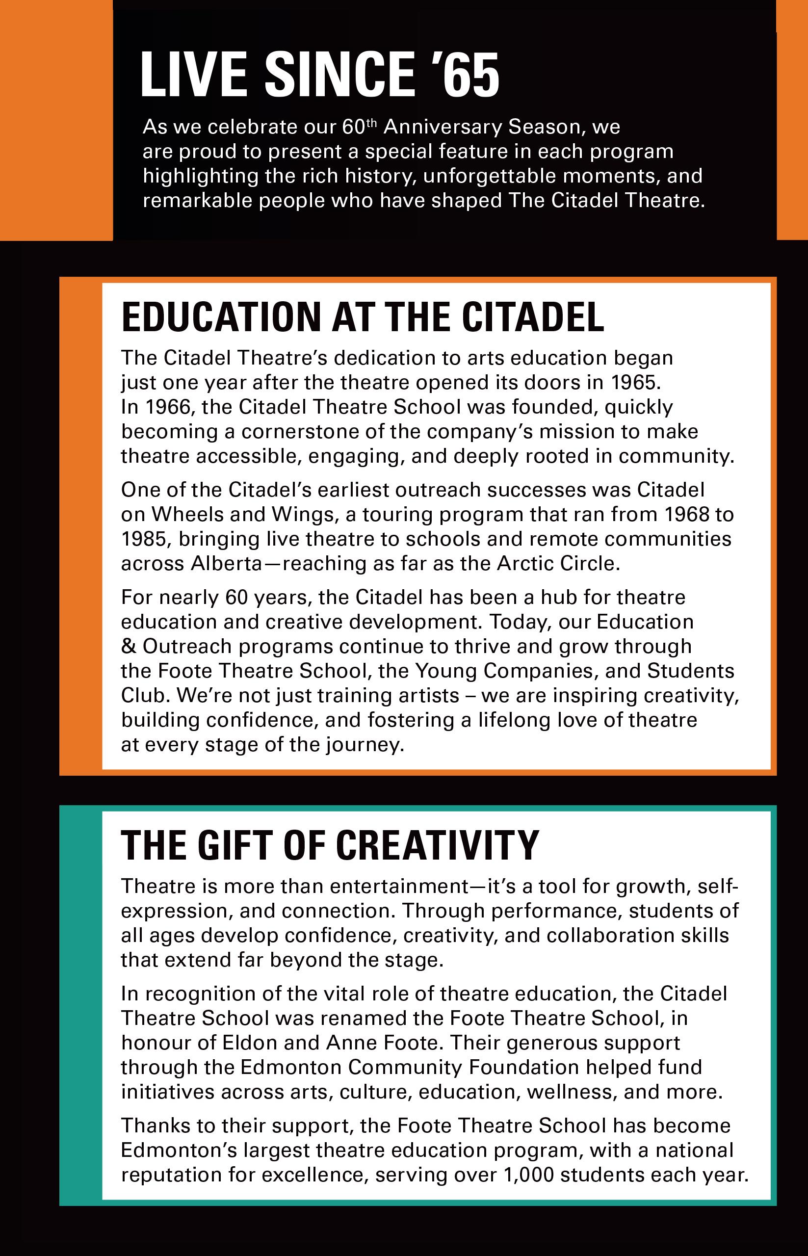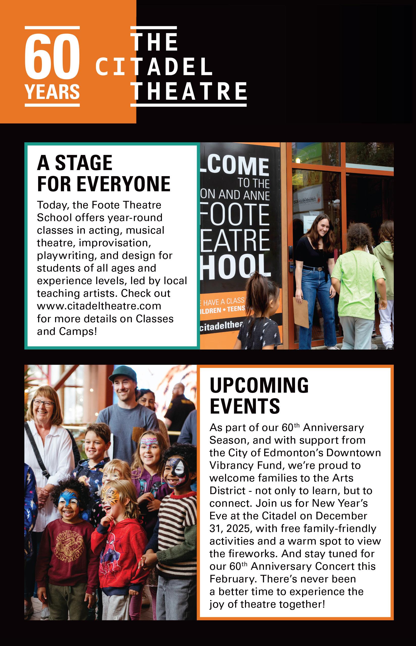 At the Citadel Theatre, we believe in the power and importance of stories. We acknowledge the stories that have come before us since time immemorial - on this land just north of the river and under these skies and stars, on this stage, and in this building with you.