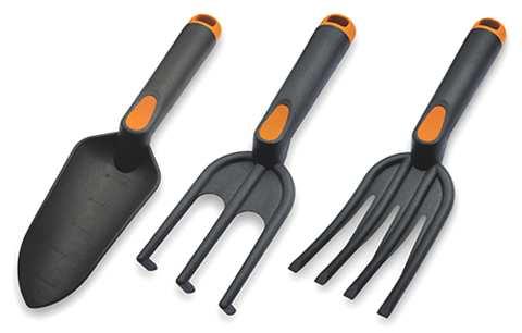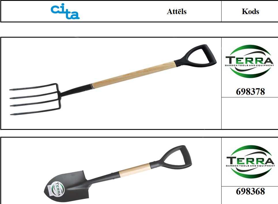 Ķerras Lāpstas Dakšas Kapļi Grābekli Birtstes un slotas Koka kāti Dārza sīkinstrumenti Dārza grieznes un zāģi Cirvji Dārza šļūtenes Šļūtenes konektori un dārza laistītāji Spaiņi, dārza lejkannas un smidzinātāji Auklas trimmeriem
