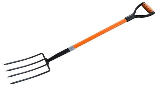 Dārza dakšas, ar 4 zariem, ar ergonomisko kātu ovāla profila un D-rokturi melns matēts pulvera pārklājums; roktura biezums 1.5 mm;