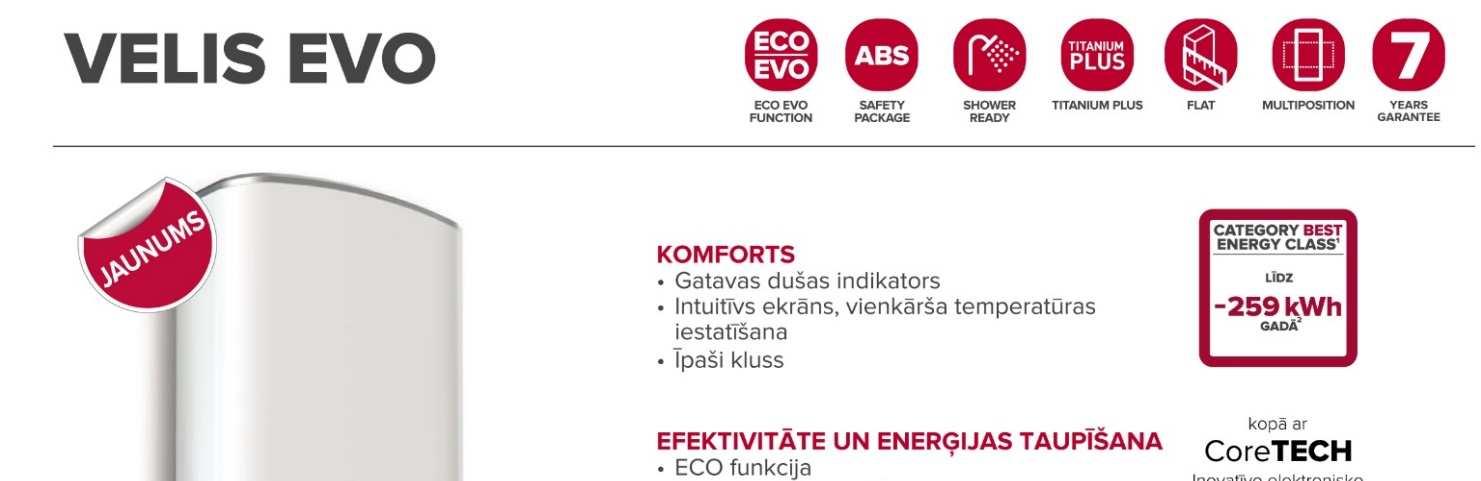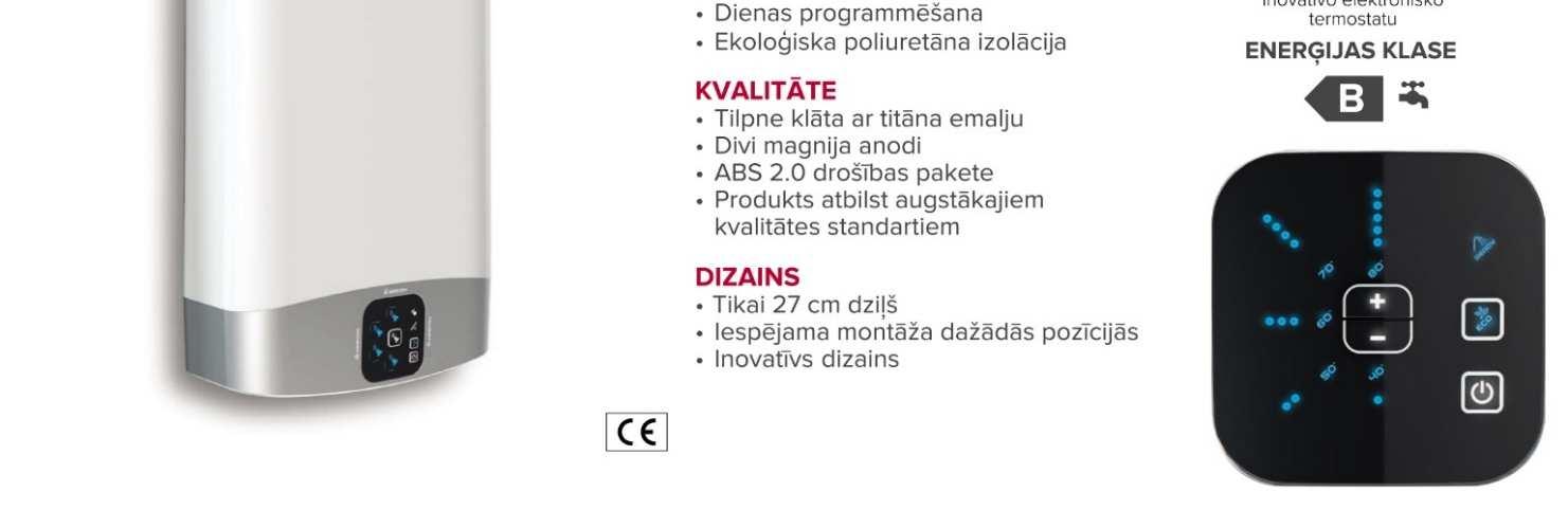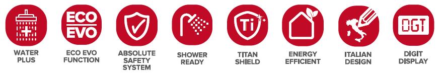 / Dubultā tvertnē nodrošina par 16% vairāk karstā ūdens / Dušas gatavības brīdinājumi lietotnē / Īpaši plāns - 27 cm dziļums / Ātri atkārtotas sildīšanas laiki, / "Eco Evo" un "Programming" funkcijas enerģijas duša gatava mazāk nekā 30 minūtēs ietaupīšanai līdz 25% / Izcils itāļu dizains / Saderīgs ar Wi-Fi viedtālruņa vadībai / Klasē labākais ErP / Anti-legionella un ABS drošības sistēma