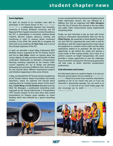 In June, we attended the King-Parliament Neighbourhood Public Information Session. This was followed by a Walking Tour that we organized with Allan Abrogena from the City of Toronto who showed us the new safety and public realm enhancements being implemented along King Street. Finally, we were fortunate to get up close with trucks during an informative demonstration field tour led by Philip Fletcher. We would like to thank Musket Transport Ltd. and CHET for organizing this event with us and for providing us with the unique opportunity to learn about the equipment in a modern tractor-trailer and the safety implications related to its operation. We also had the opportunity to get behind the wheel and operate a tractor-trailer at their training facility. Since many of us perform research on freight transportation, this event provided a unique opportunity to view the challenges from a truck driver's perspective. This learning opportunity will help make us better informed transportation professionals. Club Information and Contact For information about our student chapter or to view our first-year annual report, visit our website at www.ite.club. yorku.ca. Please let us know if you would be interested in speaking at one of our events next year or if you are interested a sponsorship package. You can email us at ite@yorku.ca or visit one of our social media pages. We also encourage you to watch our new informational video on YouTube.