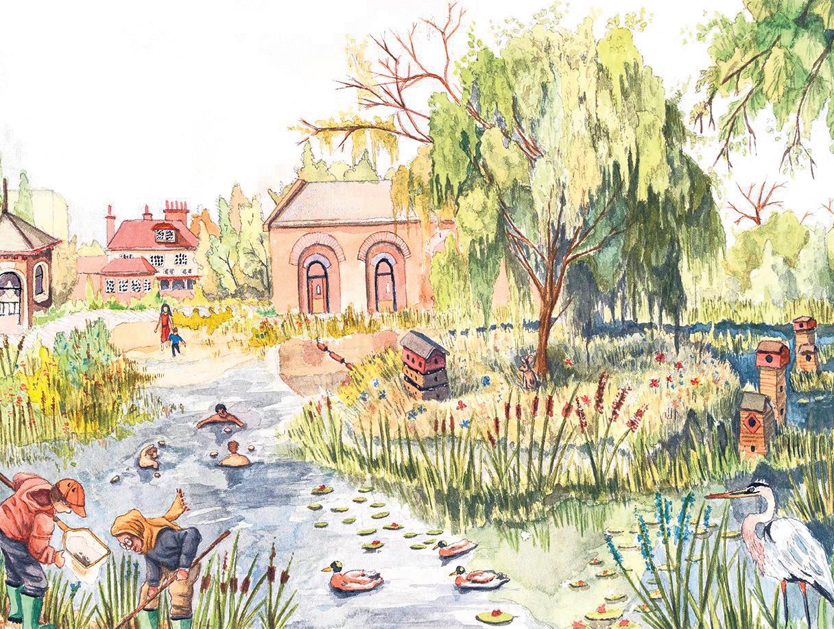 Francisco de la Mora’s tribute to campaigners working towards creating East London’s first wild swimming pond (sees story, p3), with the River Lea, sadly polluted and unhygienic for water-lovers, in the foreground