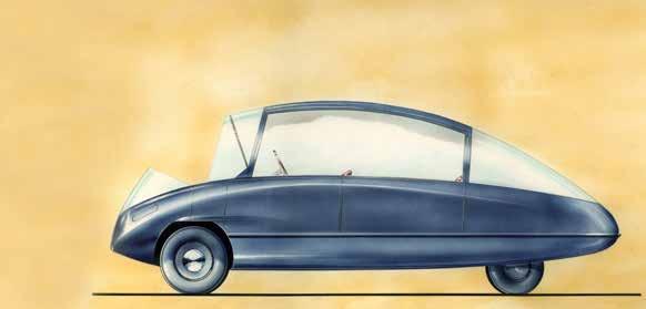 La gouache du dessous, de Bertoni est particulière de plusieurs façons. D’abord, Bertoni dessinait peu ; il préférait exprimer ses idées directement dans l’espace. En plus, le projet se développa sous une contrainte de temps bien élevée ; le temps pour s’asseoir tranquillement pour faire des dessins détaillés et réalistes, avec reflets etc., comme l’exemple montré ici, était limité. Finalement très peu de matériel de l’époque d’avant-guerre a été conservé, ce qui rend ce dessin un survivant encore plus spécial. Avec ses double pare-chocs cette voiture pourrait être une 2 2 CV. Il est particulier qu’un marchepied semble avoir été rajouté.