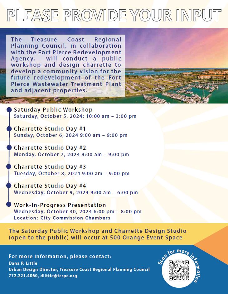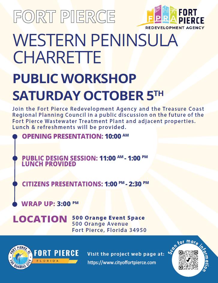 The Treasure Coast Regional Planning Council, in collaboration with the Fort Pierce Redevelopment Agency, will conduct a public workshop and design charrette to develop a community vision for the future redevelopment of the Fort Pierce Wastewater Treatment Plant and adjacent properties on South Hutchinson Island The Public Workshop will take place on Saturday, October 5th from 10am to 3pm at the 500 Orange Event Space (500 Orange Avenue, Fort Pierce, FL). A host committee is currently being formed and will serve primarily as a logistics team and a public outreach conduit for the charrette.