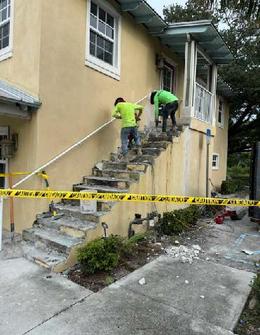 On Monday, August 5, 2024, work crews initiated the demolition of the existing east staircase As a safety measure, they temporarily blocked off the sidewalk for pedestrians. Additionally, a staging area was set up for the placement of the dumpsters and materials.