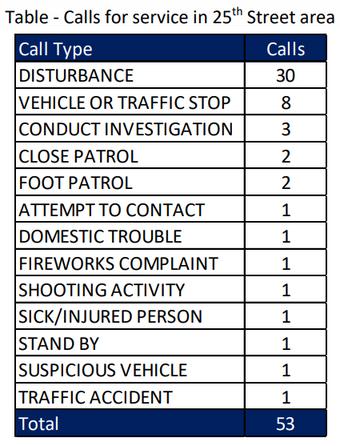 During the month of August 2024, there were a total of 18 FPRA details worked for the North 25th area from Avenue O to Avenue M . There were 53 calls for service during the detail times. Disturbances accounted for more than half of the total calls the area.