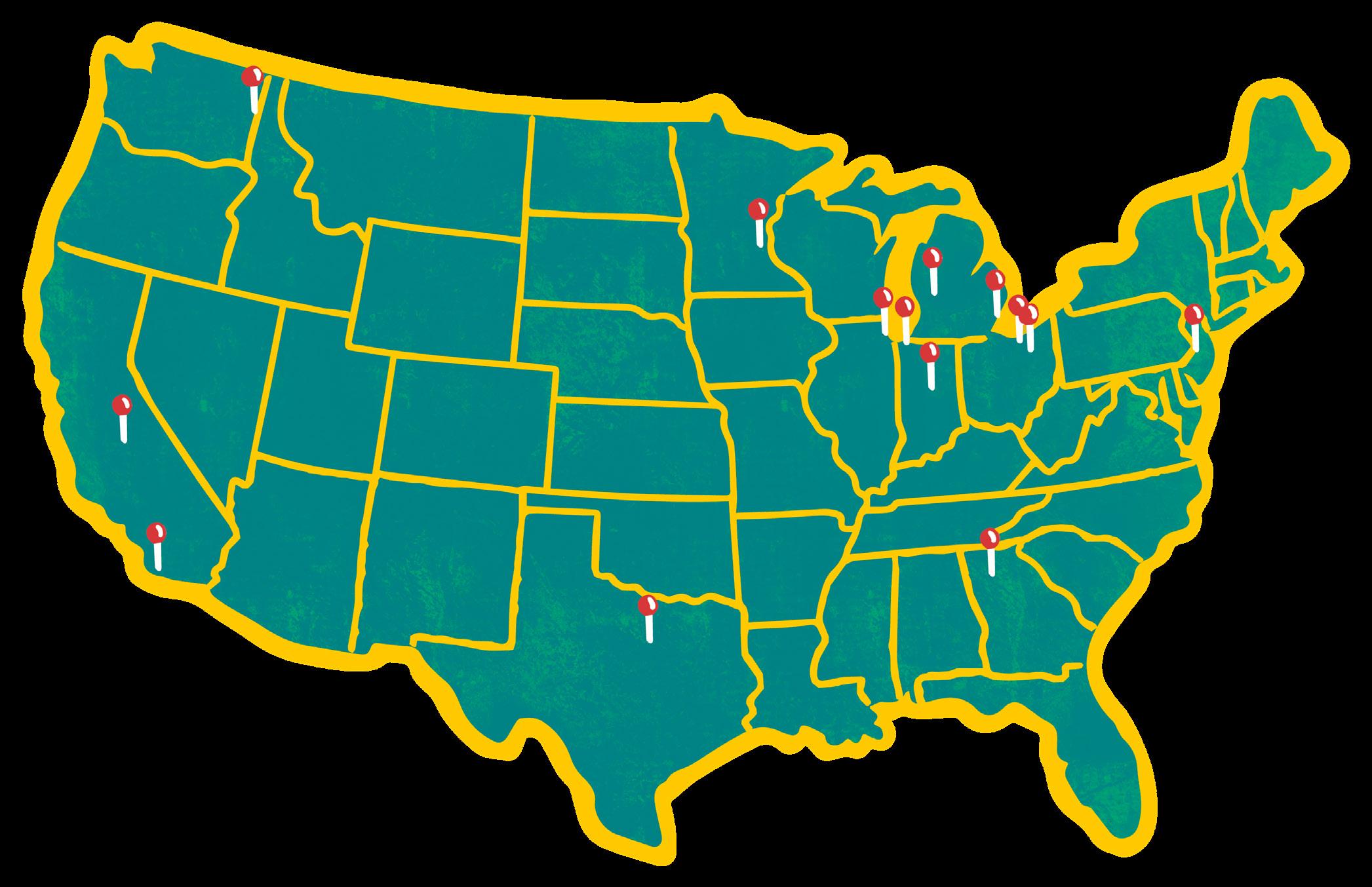 Akron: Signal Akron • Atlanta: Canopy Atlanta • Cleveland: Signal Cleveland • Dallas: Dallas Free Press • Detroit: Outlier Media • Fresno: Fresnoland • Gary: Capital B Gary • Grand Rapids: Grand Rapids Community Media Center • Indianapolis: Mirror Indy • Minneapolis: Pillsbury United Communities • Omaha: Nebraska Journalism Trust • Philadelphia: Resolve Philly • San Diego: inewsource • Spokane: Range Media