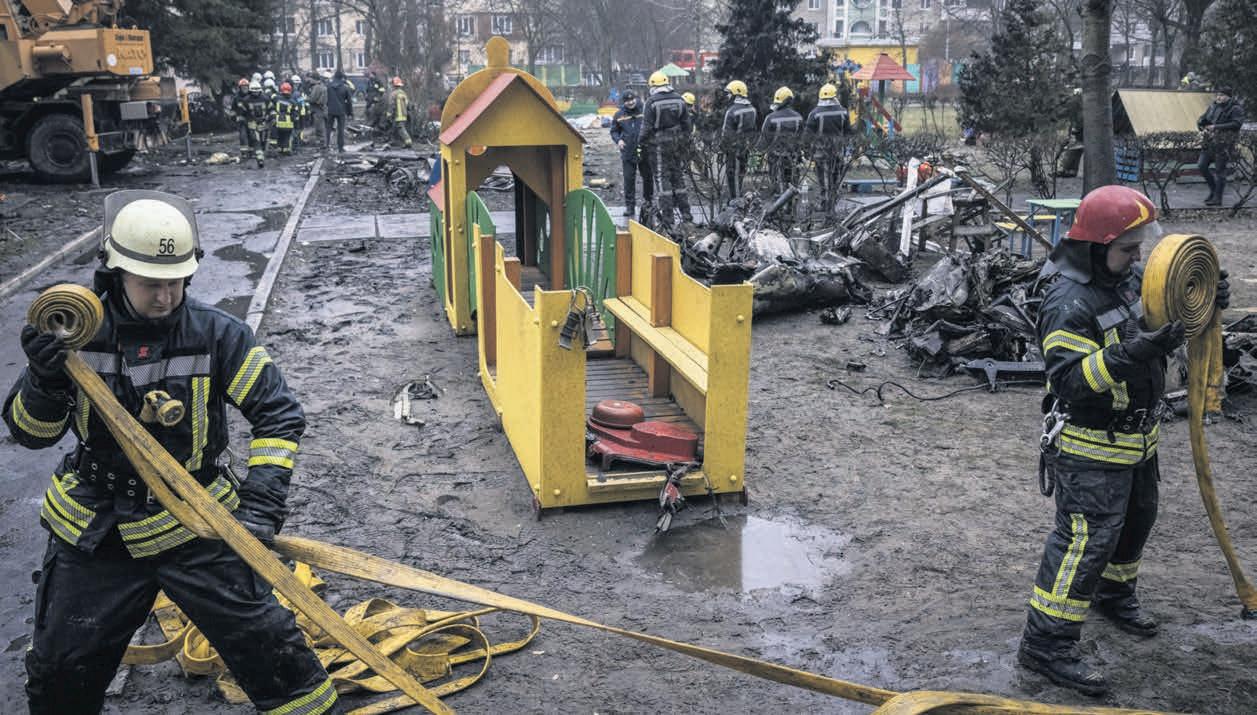KYIV TRAGEDY Firemen work at debris near a nursery in a suburb in Kyiv following a helicopter crash that killed eighteen people including minister Denys Monastyrsky