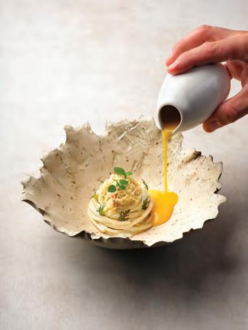 If there’s another thing that the Italians and Japanese do to nearperfection, it’s food. In Japan, you’ll never forget the experience of scarfing down fatty tuna at stand-up sushi bars or eating skewers at smoky wooden izakayas. It might sound crazy to come to the home of sushi, ramen and omakase, and eat Italian food, but you’d be missing a trick if you avoid Tokyo pizzerias like Savoy or Orange Covo. The latter is a wood-fired joint run by a Japanese chef who trained in Italy, and has dedicated his craft to replicating their techniques. This reverence for ingredients, technique and full-whack flavour comes across at Il Ristorante Niko Romito, one of two Bvlgari’s (the other being the ultra-exclusive eight-seater, Sushi Hōseki). I get the menu degustazione, a six-course experience of “rustic Italiana”. This isn’t homely nonna style food, rather finetuned Michelin fodder. First the bread: grissini the length of my entire arm, seeded crackers and soft, crunchy bread are placed down next to a pool of olive oil so good I’d drink it from a wine glass. Next comes a broth of carrot, onion and celery – Italy’s ‘holy trinity’ soffritto –steeped in champagne with a single sage leaf. I’m instructed to sip the clear golden liquid like miso soup. Courses of homemade tortellini, tonnato, and al dente pasta with lobster follow. Resident chef Mauro Aloisio tells me that the restaurant’s produce is sourced as locally as possible; cheese from dairy epicentre Hokkaido, fresh fish from Tsukiji market. Some non-negotiables – parmesan, olive oil – have to be imported from Italy. For dessert, creamy ricotta gelato is drizzled in aged balsamic and spiked with tart amarena cherries. The finale? A strong Italian coffee, of course. This one comes in a Ginori porcelain cup along with a 25-day aged lemon juice, a bit like a non-alcoholic Limoncello.