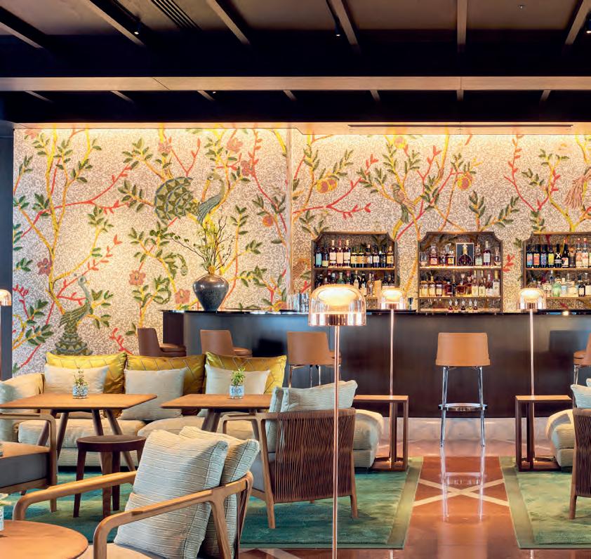 To use a slightly clumsy football metaphor, it’s a bit like Brighton football player Mitoma being under Italian management. There’s nothing clumsy about the decor, though: restrained and simple Japanese design meets Italian flair, with angular wood sitting alongside Murano glass, gold and marble. Kimonostyle bathrobes are supplied, crisp white bed linen comes from Milan tailor Rivolta Carmignani, and the walls have goldthreaded fabrics from ancient Japanese textile store Hosoo. You can even run past the Colosseum, virtually, on the