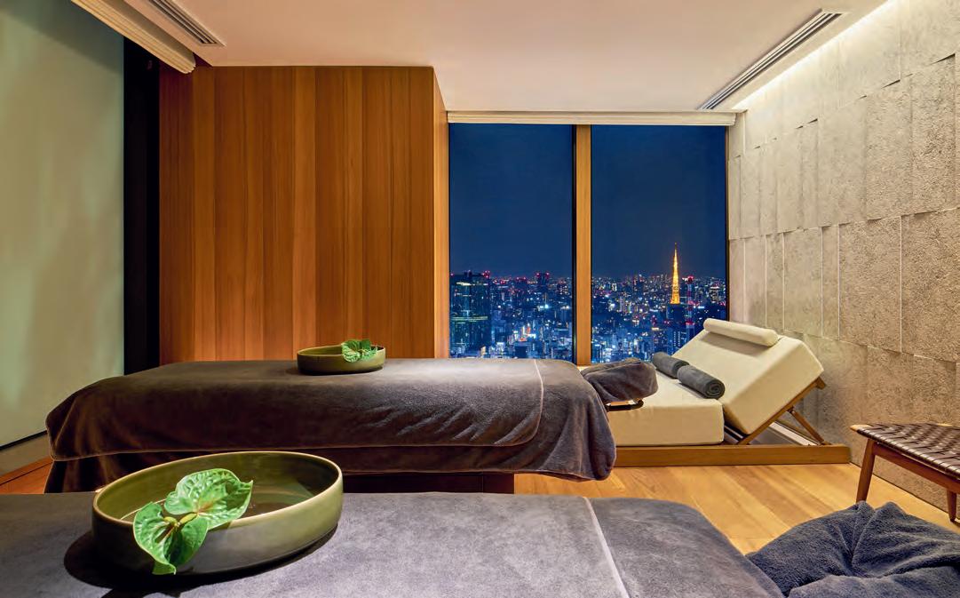 treadmill at the fitness centre. In old Roman bath houses, men and women didn’t bathe together. And neither do they in today’s popular Japanese onsens, where nude bathing is the norm. The Bvlgari’s indoor pool and spa area, clad in glittering stones reminiscent of ancient mosaics, has its own gender-segregated onsen with a heated bath, hammam and sauna. As a British person who doesn’t usually get their kit off in front of strangers, I’m secretly grateful that no one else is there when I arrive – with just the city skyline to watch me submerge my limbs into the steaming water.