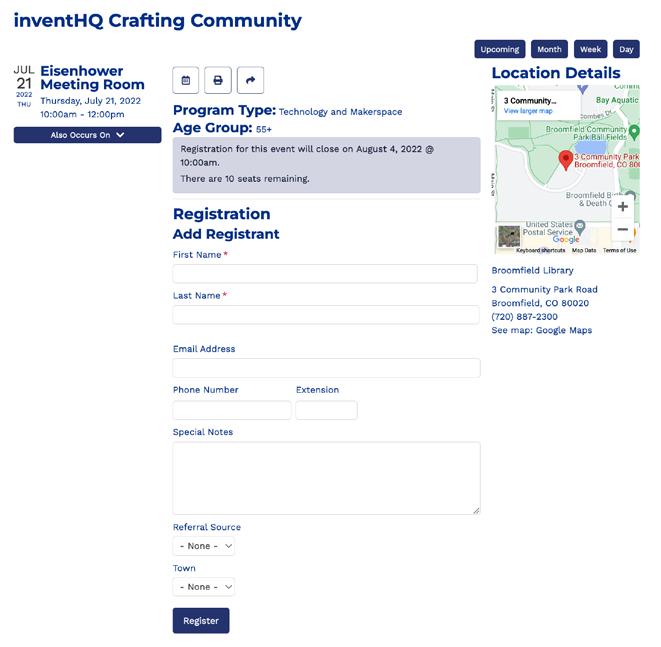 Most Library, Arts, History and CSU Extension programs are free and do not require advanced registration. If a program does require registration it will have this icon: If registration is required, you can register one month before the program at Compass.Broomfield.org