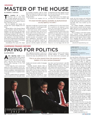 he creation of a tenantprotection unit to crack down on shady landlords who flout the state’s rent laws was the only mention of housing policy in Gov. Andrew Cuomo’s State of the State speech. But for landlords and tenants, the proposal isn’t exactly bringing down the house. Michael McKee, of the Tenants Political Action Committee, said that without new funding for the protection unit and major changes to the state’s administrative code, law-breaking landlords will continue to cheat the system with impunity. He claimed that employees at the state Division of Homes and Community Renewal described the governor’s plan to him as “rearranging the deckchairs on the Titanic.” Assemblyman Vito Lopez, who chairs
