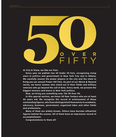 At City & State, we like our lists. Every year we publish two 40 Under 40 lists, recognizing rising stars in politics and government in New York City and in Albany. We carefully assess the power players in the city and the state to bring you our annual Power 100 lists. As part of our Above & Beyond series, we honor women who stand out in their fields and military veterans who go beyond the call of duty. Every week, we present the biggest winners and losers in New York politics. Now, we bring you something new: the 50 Over 50. In this special section, we honor 50 New Yorkers who are at least 50 years old. We recognize the record of achievement of these outstanding figures, who have distinguished themselves in academia, advocacy, business, government, organized labor and other fields and professions. Many of them are widely known. Others have become influential figures behind the scenes. All of them have an impressive record of accomplishment. Congratulations to them all!