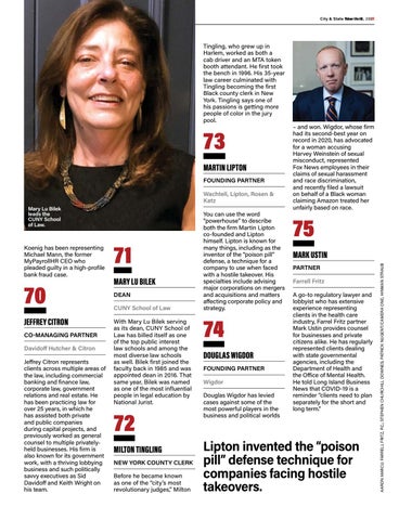 73 MARTIN LIPTON FOUNDING PARTNER Wachtell, Lipton, Rosen & Katz Mary Lu Bilek leads the CUNY School of Law.
