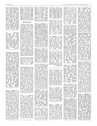 Notice of Qualification of PWP DYNAMIC MULTIASSET FUND GP LLC Appl. for Auth. filed with Secy. of State of NY (SSNY) on 05/07/18. Office location: NY County. LLC formed in Delaware (DE) on 05/02/18. SSNY designated as agent of LLC upon whom process against it may be served. SSNY shall mail process to the LLC, 767 Fifth Ave., NY, NY 10153. DE addr. of LLC: Corporation Service Co., 251 Little Falls Dr., Wilmington, DE 19808. Cert. of Form. filed with Secy. of State, State of DE, Dept. of State, Townsend Bldg., Dover, DE 19901. Purpose: Any lawful activity. Notice of Qualification of ONE BROADWAY OWNER, LLC Appl. for Auth. filed with Secy. of State of NY (SSNY) on 05/04/18. Office location: NY County. LLC formed in Delaware (DE) on 04/24/18. Princ. office of LLC: c/o Midtown Equities LLC, 141 5th Ave., 2nd Fl., NY, NY 10010. SSNY designated as agent of LLC upon whom process against it may be served. SSNY shall mail process to the LLC at the addr. of its princ. office. DE addr. of LLC: c/o Corporation Service Co., 251 Little Falls Dr., Wilmington, DE 19808. Cert. of Form. filed with DE Secy. of State, 401 Federal St., Dover, DE 19901. Purpose: Any lawful activity. Notice of Qualification of HedgePremier/ExodusPoint Partners Fund LP. Authority filed with NY Secy of State (SSNY) on 6/6/18. Office location: New York County. LP formed in Delaware (DE) on 5/31/18. SSNY is designated as agent of LP upon whom process against it may be served. SSNY shall mail process to: 111 8th Ave, NY, NY 10011. DE address of LP: 1209 Orange St, Wilmington, DE 19801. List of names and addresses of all general partners available from SSNY. Cert. of Limited Partnership filed with DE Secy of State, 401 Federal St, Ste 4, Dover, DE 19901. The name and address of the Reg. Agent is CT Corporation System, 111 8th Ave, NY, NY 10011. Purpose: any lawful activity.