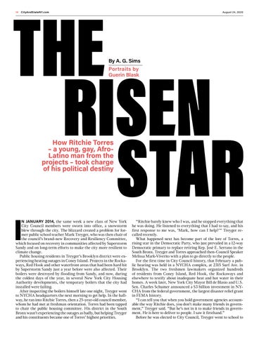 N JANUARY 2014, the same week a new class of New York City Council members were sworn into office, a snowstorm blew through the city. The blizzard created a problem for former public school teacher Mark Treyger, who was then chair of the council’s brand-new Recovery and Resiliency Committee, which focused on recovery in communities affected by Superstorm Sandy and on long-term efforts to make the city more resilient to climate change. Public housing residents in Treyger’s Brooklyn district were experiencing heating outages in Coney Island. Projects in the Rockaways, Red Hook and other waterfront areas that had been hard hit by Superstorm Sandy just a year before were also affected. Their boilers were destroyed by flooding from Sandy, and now, during the coldest days of the year, in several New York City Housing Authority developments, the temporary boilers that the city had installed were failing. After inspecting the boilers himself late one night, Treyger went to NYCHA headquarters the next morning to get help. In the hallway, he ran into Ritchie Torres, then a 25-year-old council member, whom he had met at freshman orientation. Torres had been tapped to chair the public housing committee. His district in the South Bronx wasn’t experiencing the outages as badly, but helping Treyger and his constituents became one of Torres’ highest priorities.