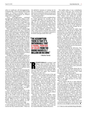 ITCHIE’S REALLY a cool guy,” said Gibson, who is friends with Torres. “For those that have the chance to hang out with him, going out to dinner and being in social settings, they see that Ritchie’s very laid back. He’s not loud. He’s very quiet. You wouldn’t think that he talks a lot.” Gibson confesses that because of his age and stature – he is slender and stands 5 feet 10 inches tall – she tends to regard Torres as a little brother. Last summer, at community parties in the Bronx, they danced with residents. “We’re all people of color, so I assumed that Ritchie could dance,” she recalls, laughing. “So I was like, ‘Come on, Ritchie, come on let’s dance to bachata, hip hop.” At first Torres was a little bit awkward, she recalled affectionately, before he eventually got the hang of it. “I said, ‘Ritchie, come on, now, you’re a Black man, you have to have rhythm!’” Because she chaired the public safety committee, Gibson was involved in what Torres characterizes as his most challenging legislative battle to date. Her committee heard the original Right to Know Act – the law that set new measures for police interactions with civilians – which was two bills, one authored by Torres and one by Council Member Antonio Reynoso.