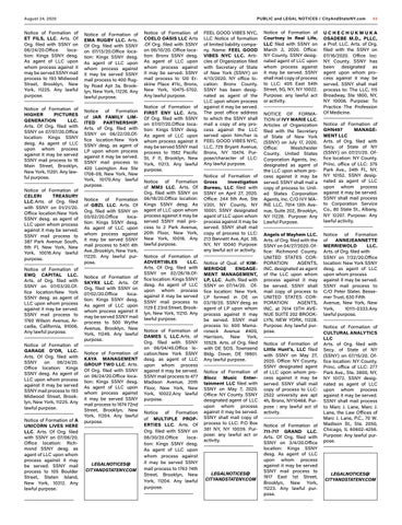 Notice of Formation of CELERI TREASURY LLC.Arts. of Org. filed with SSNY on 01/21/20. Office location:New York SSNY desg. as agent of LLC upon whom process against it may be served. SSNY mail process to 387 Park Avenue South, 5th Fl, New York, New York, 10016.Any lawful purpose. Notice of Formation of EWQ CAPITAL LLC. Arts. of Org. filed with SSNY on 07/03/20.Office location:New York SSNY desg. as agent of LLC upon whom process against it may be served. SSNY mail process to 1760 Wilson Avenue, Arcadia, California, 91006. Any lawful purpose. Notice of Formation of GARAGE D’OR, LLC. Arts. Of Org. filed with SSNY on 06/24/20. Office location: Kings SSNY desg. As agent of LLC upon whom process against it may be served SSNY mail process to 193 Midwood Street, Brooklyn, New York, 11225. Any lawful purpose. Notice of Formation of A UNICORN LIVES HERE LLC. Arts. Of Org. filed with SSNY on 07/06/20. Office location: Richmond SSNY desg. as agent of LLC upon whom process against it may be served. SSNY mail process to 105 Boulder Street, Staten Island, New York, 10312. Any lawful purpose.