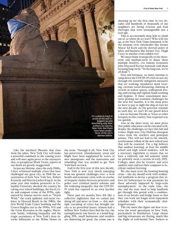 shooting up for the first time in two decades and hundreds of thousands of our neighbors are facing eviction and food shortages that were unimaginable just a year ago. This is an extremely deep hole to climb out of, so where do we start? Who will rise up, as the New York Times lamented, to be the ultimate civic cheerleader like former Mayor Ed Koch and the shrewd uniter of labor and business like former Gov. Hugh Carey in another crisis-ridden era? We must think strategically in the shortterm and medium-term to douse these multiple bonfires. (As famous economist John Maynard Keynes famously said about focusing long-term: “In the long run, we’re all dead.”) First and foremost, we must continue to tamp down the COVID-19 crisis in our city through the scientific mitigation measures that are working: mandatory mask wearing, extreme social distancing, limiting of crowds in indoor spaces, widespread testing and tracing and vigilant hand-washing and hygiene. If these containment measures prolong our economic challenges for the next few months, it is the steep price we have to pay to right the ship of state for the next decade. As the governor reminds us each day, we can’t let our guard down – lest we become Florida or Texas or other hotspots in this country that reopened way too quickly. Also in the short term, we must prove that public education can be executed well, despite the challenges we face this fall and winter. Right now, City Hall has divergent views from the teachers and principals unions. This will not lead to the smooth, synchronous rollout of the new school year that will be essential. I’m a big believer that outdoor learning, at least for middle school and high school students, will be a necessary ingredient to ensure that we have a relatively safe fall semester while we patiently await a vaccine in early 2021. Colleges must also be creative and erect outdoor tents and use their campuses to facilitate outdoor learning. We also must avert the looming housing crisis – the city should work with residential landlords to devise a program that allows for forbearance in rent payments for those adversely impacted by large-scale unemployment. At the same time, the city and the state need to help landlords get through this period with a combination of tax breaks and bridge loans so that they can work out longer term repayment schedules with their economically challenged tenants. The city must also figure out how to reverse the retail apocalypse in New York, particularly in Manhattan. Large chains and big restaurants are fleeing, much like the flight of well-heeled New Yorkers to