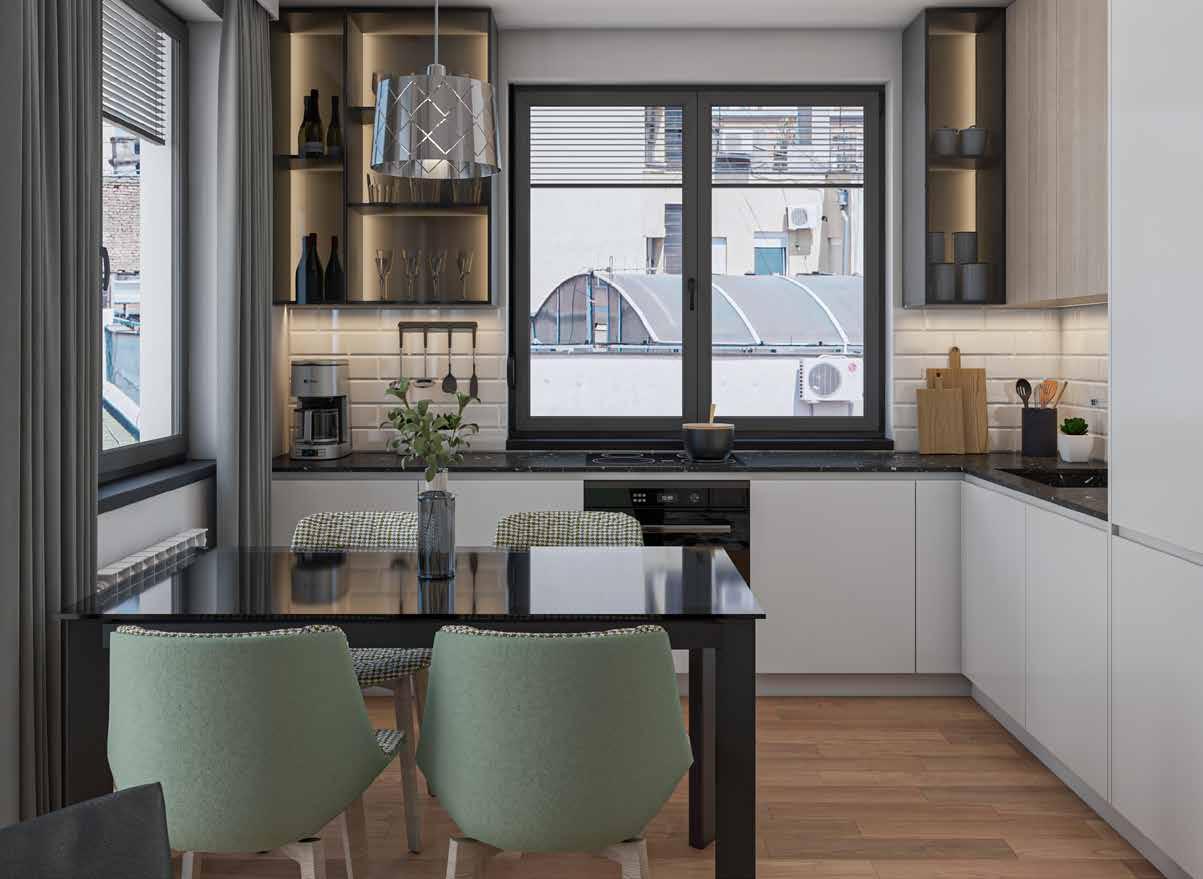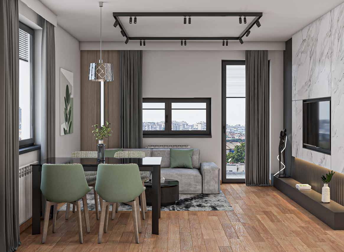 Svi stanovi imaće podno grejanje na toplotnim pumpama, dok će PVC grafitna stolarija pružiti odličnu toplotnu i zvučnu izolaciju. Poseban prostor za odlaganje dečijih kolica i bicikala biće namenjen svim vlasnicima stanova.