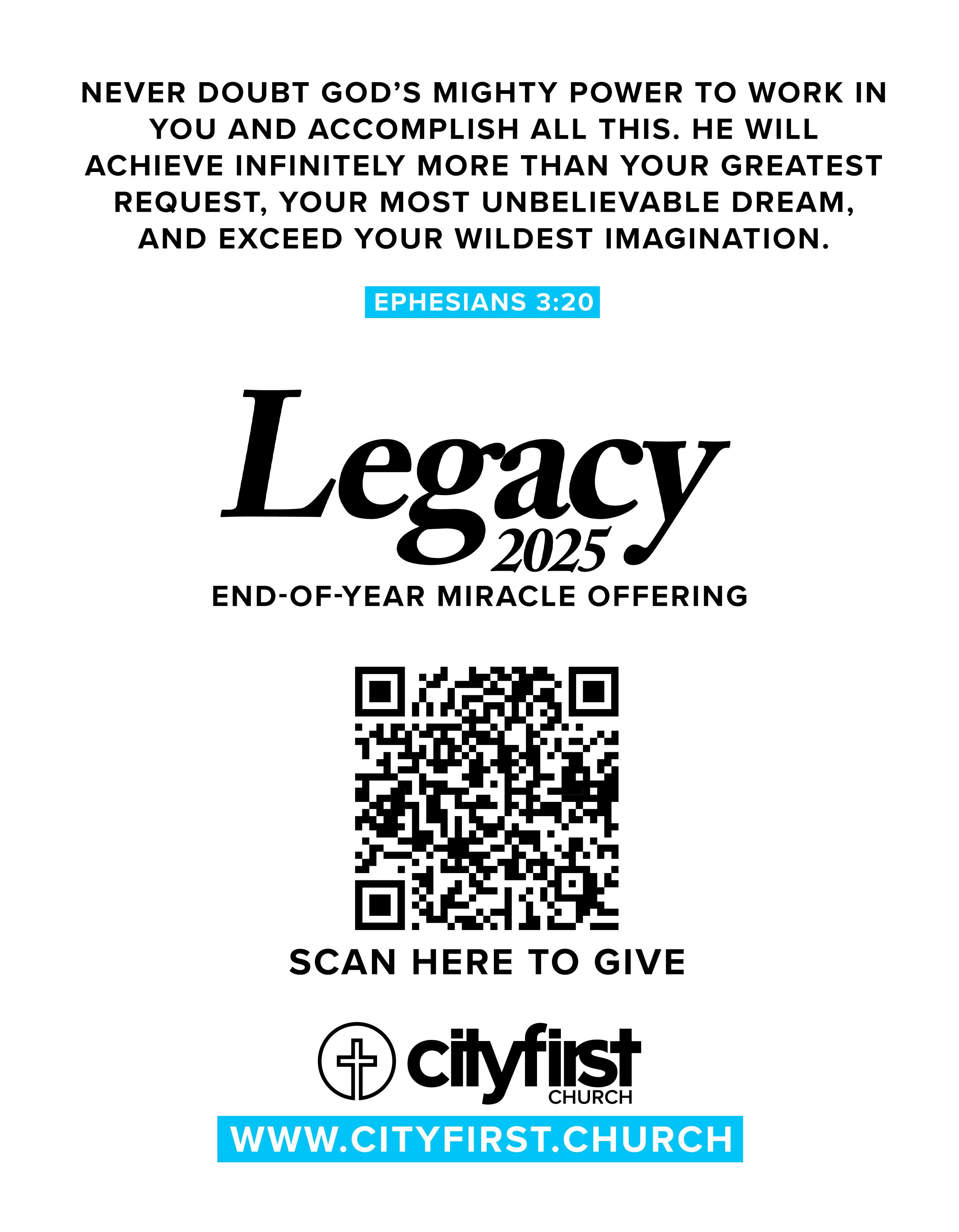Legacy is above and beyond our regular giving. There are five Legacy Lanes we focus on throughout the year: City First Building and Expansion, Local Missions, National Missions, World Missions, and City First Leadership College. Because of God’s faithfulness and your generosity, we’ve accomplished so much together this year! This Legacy Report testifies to the goodness of God!