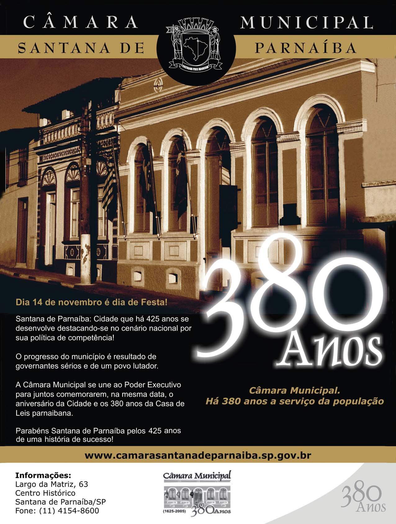 a Câmara Municipal abriu oficialmente as comemorações dos seus 380 anos de existência (completados no último dia 14). A programação contou com uma sessão solene que apresentou um vídeo institucional com a trajetória da Casa de Leis. Logo após, foi aberta ao público a Exposição Histórico-Cultural dos 380 anos (1625-2005), que ficará em cartaz até o dia 30 de novembro, no Centro de Memória e Integração Cultural, o CEMIC, que fica no Largo da Matriz, 49, no Centro Histórico. Compõem a mostra diversas obras e fotografias, em homenagem ao aniversário da Câmara, feitas por artistas plásticos e fotógrafos da região. Documentos e fotos antigos do Legislativo também serão expostos. E no dia 18, véspera da comemoração dos 99 anos de elevação da Vila Parnayba à categoria de cidade, em 19 de novembro de 1906, foi realizada uma apresentação da Orquestra Sinfônica de Cordas de Barueri, na Igreja Matriz, para lembrar a data.