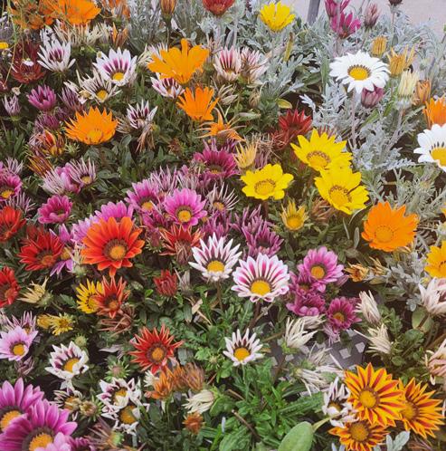 flowers or Gazania Big Kiss Yellow and Big Kiss Red. Their colours are vibrant and will flower nearly all year round.