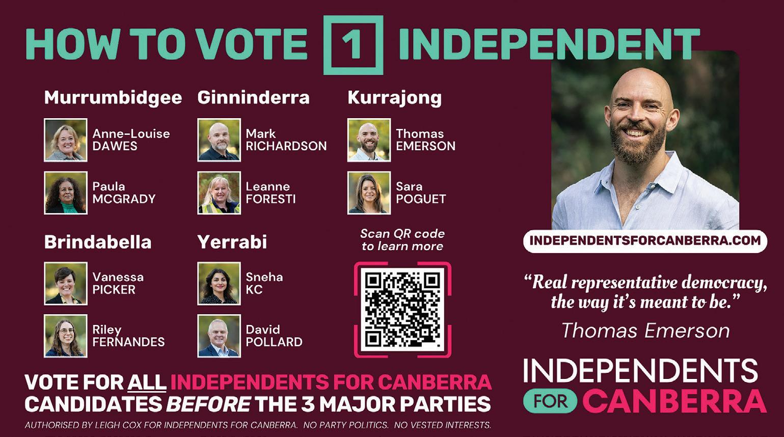 Thomas Emerson and David Pollard are examples from the Independents for Canberra, along with Vanessa Picker, Leanne Foresti and AFP Officer Mark Richardson, who are part of the group committed to a stronger Legislative Assembly and ensuring whoever takes government is held accountable.