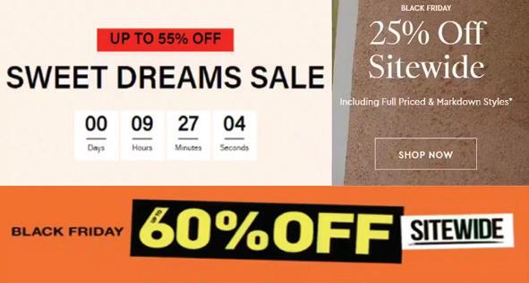 • “Up to X% off” discounts that only apply to a few items (or the “up to” text is not prominently displayed).
