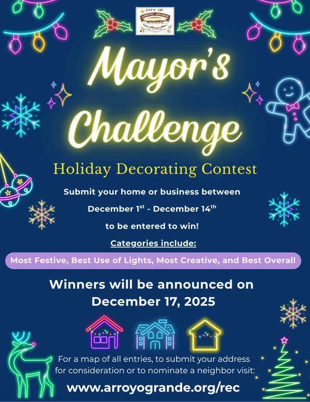 ¡Celebra la temporada mostrando tu espíritu navideño! El Concurso de Decoración Navideña del Desafío del Alcalde invita a los negocios y residentes de Arroyo Grande a iluminar la ciudad con decoraciones espectaculares Envía tu participación en línea entre el 1 y el 14 de diciembre en arroyogrande.org/rec y consulta el mapa, que estará disponible en línea, para recorrer todas las brillantes exhibiciones de la ciudad. Los ganadores se anunciarán el 17 de diciembre en las categorías de Más Festivo, Mejor Uso de Luces, Más Creativo y Mejor en General