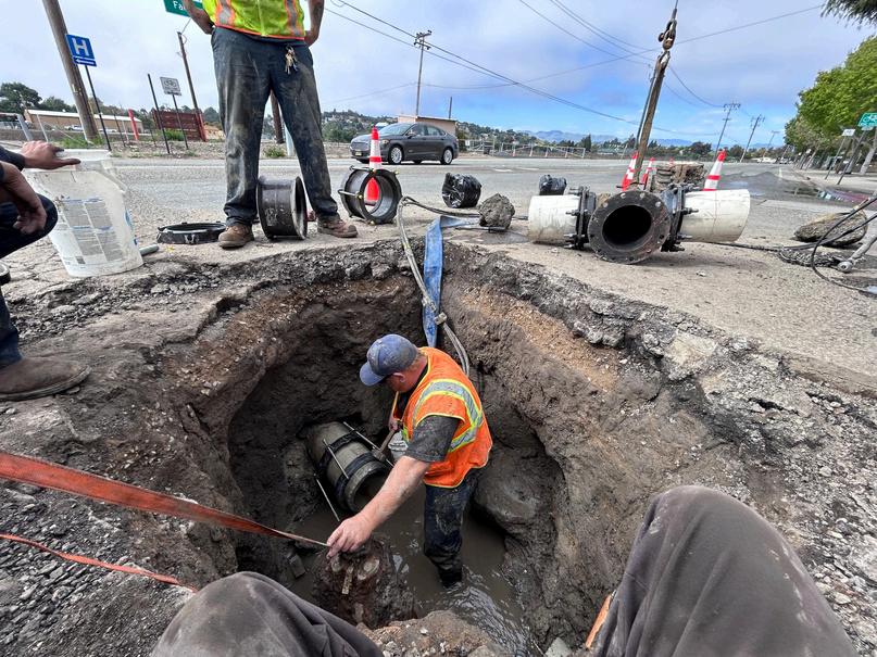 Public Works Crews repair a water main leak at the intersection of Valley Rd and Fair Oaks Ave on Saturday, May 11, 2024