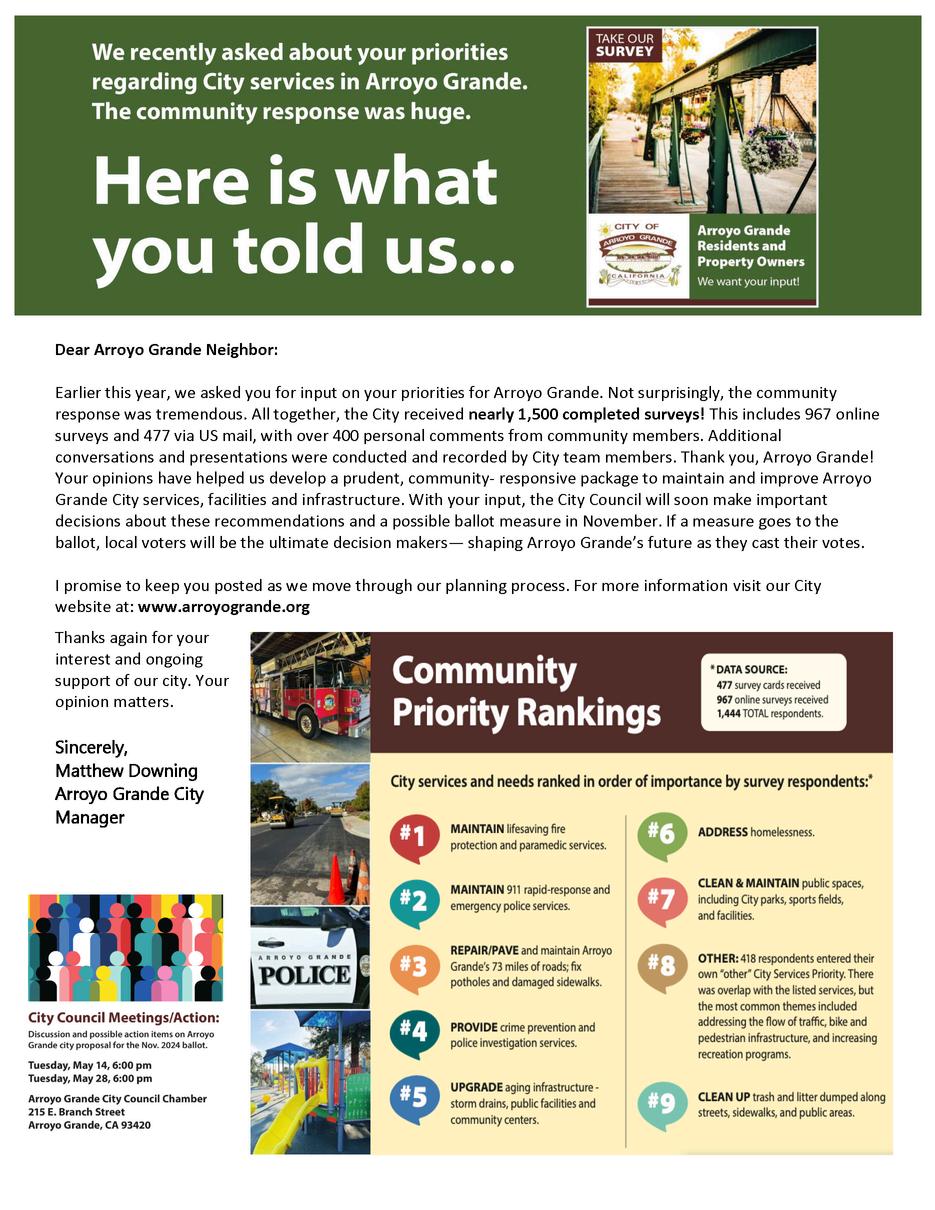 In this edition, we also highlight the results of the survey mailed out to residents in early March. We had a fantastic response with nearly 1,500 submissions. We want to share what we learned from you. If you participated, whether by mail or online, I want to extend my sincere gratitude Your feedback and comments on the survey are invaluable, and we look forward to your continued engagement Lastly, I want to express my gratitude for the warm welcome I have received as I step into my role of City Manager. Thank you for your ongoing support and engagement in our community. I firmly believe that through collaboration, there are no challenges beyond our ability to overcome Together, we'll work to ensure that Arroyo Grande thrives both now and into the future