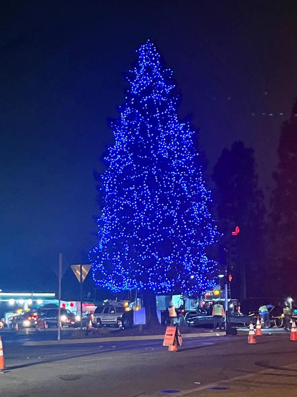 With funding from the Arroyo Grande and PismoFive Cities Rotary Clubs, the redwood tree at the Village gateway is now lit with color changing LED lights A tree lighting ceremony was held May 9th with a message from Mayor Ray Russom.