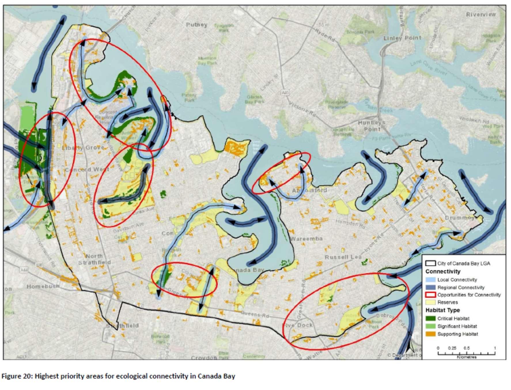 Insight Ecology (2014) recommended five priority biodiversity connectivity target zones in City of Canada Bay, which include Iron Cove Creek and Timbrell Park toRodd Point.