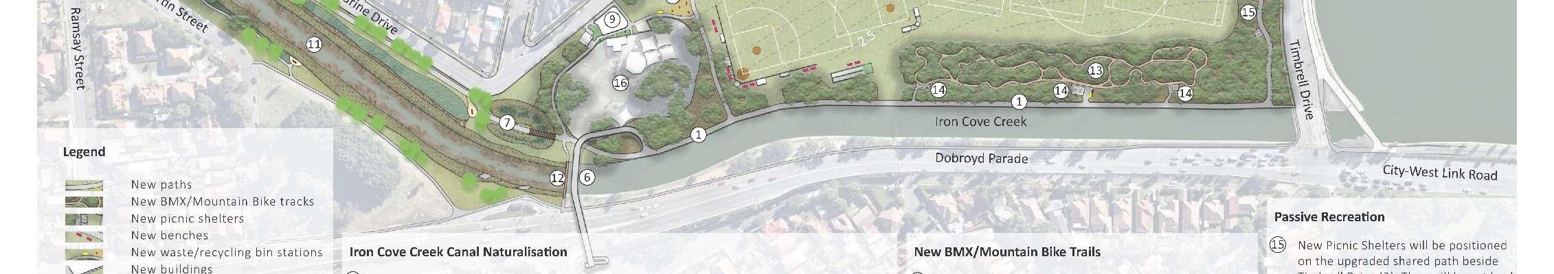 The current off-leash area in Timbrell Park is required to be fenced for safety from the nearby road. However this area will not be available when the Iron Cove Creek naturalisation project is under construction and completed.