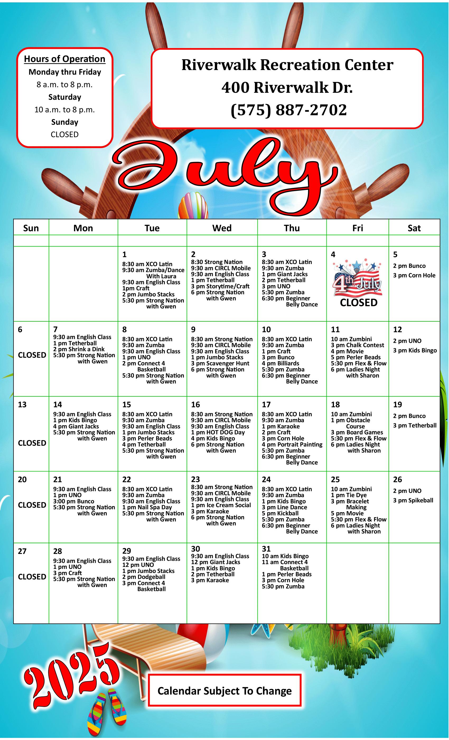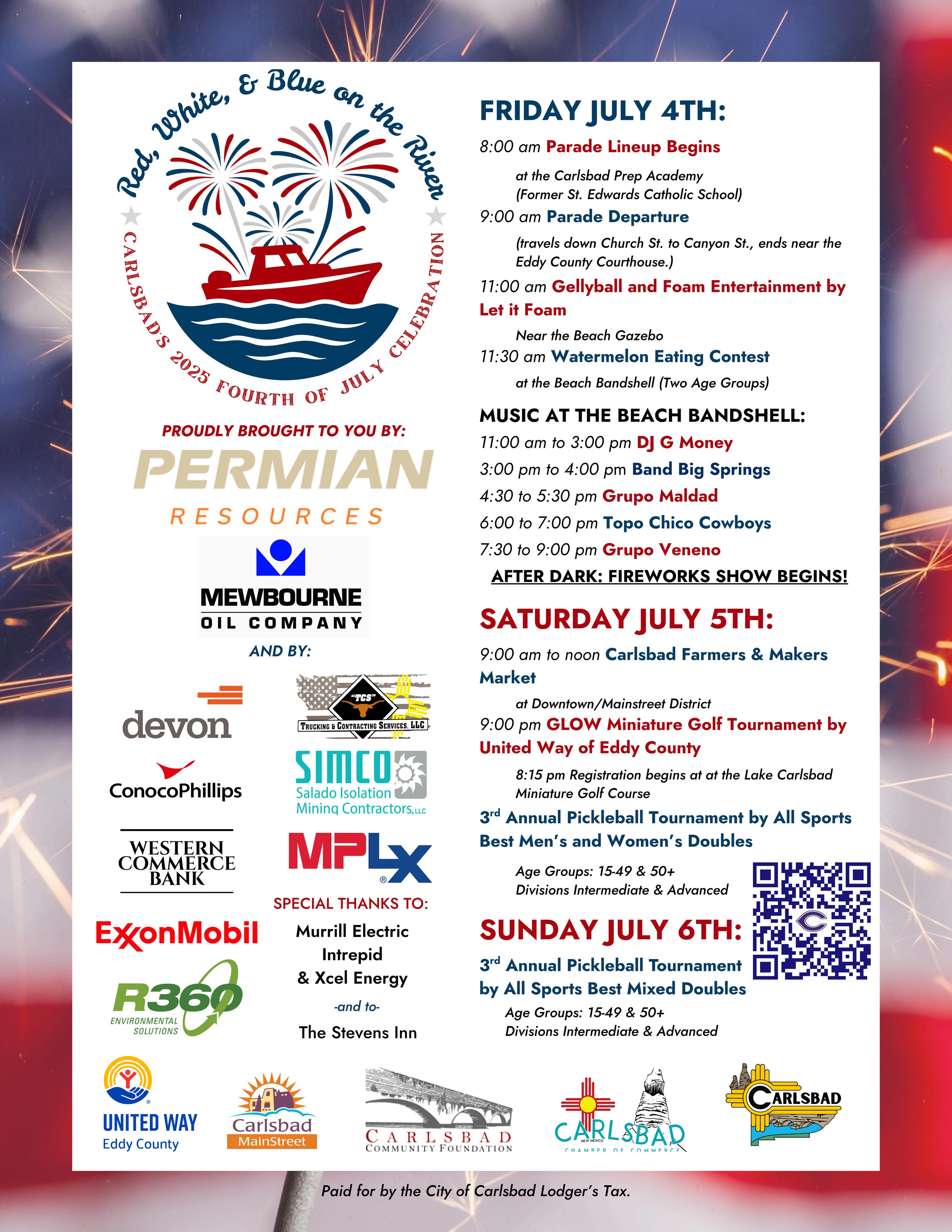Our Fourth of July Celebration: Red, White and Blue on the River is packed with fun activities for all ages This year ’ s lineup includes the morning parade, foam and gellyball entertainment, a watermelon-eating contest, music from DJ G Money, and live performances by Band Big Springs, Grupo Maldad, Topo Chico Cowboys, and Grupo Veneno. We will close out the evening with the best fireworks display in Southeast New Mexico over the Pecos River. All activities are free and open to the public, and we hope to see you and your family enjoying the celebration