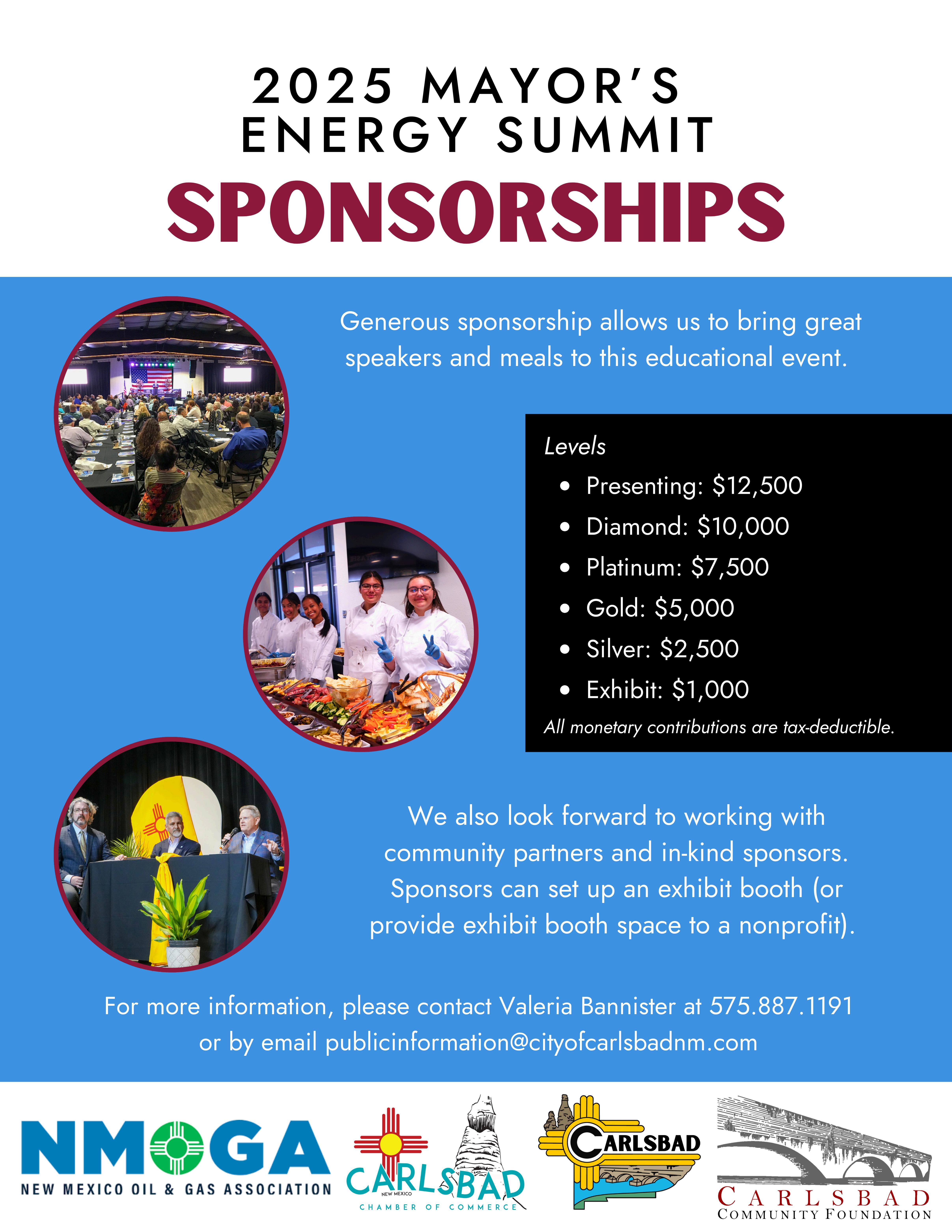 nominate someone, or if your business is interested in sponsorship, please visit www carlsbadenergysummit com or contact Valeria Bannister at vabannister@cityofcarlsbadnm.com.