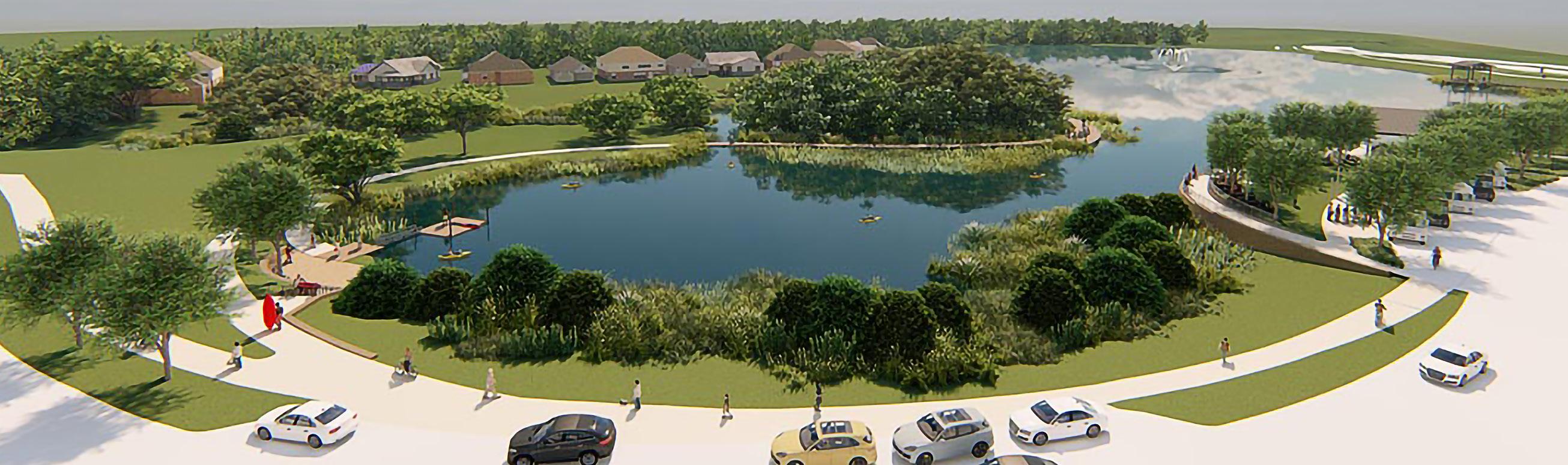 The design focuses on adding elements that encourage the community to gather, pause during a run, and enjoy the outdoors. The project will include a pavilion with oversized steps leading to the lake, landscape trees and native plants, a food truck area with outdoor seating, an extension from the existing trail with surface pavement, the addition of an ADA-compliant kayak dock for loading and unloading, and potentially, an additional parking lot across the street.