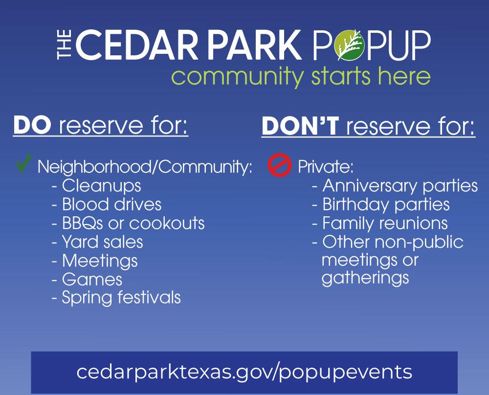 Recreation Center community rooms and park pavilions make a great destination for your next reservation! Turn to page 18 for more details, or visit cedarparktexas.gov/play. Please note that some facilities can be requested online, while others must be reserved in person.