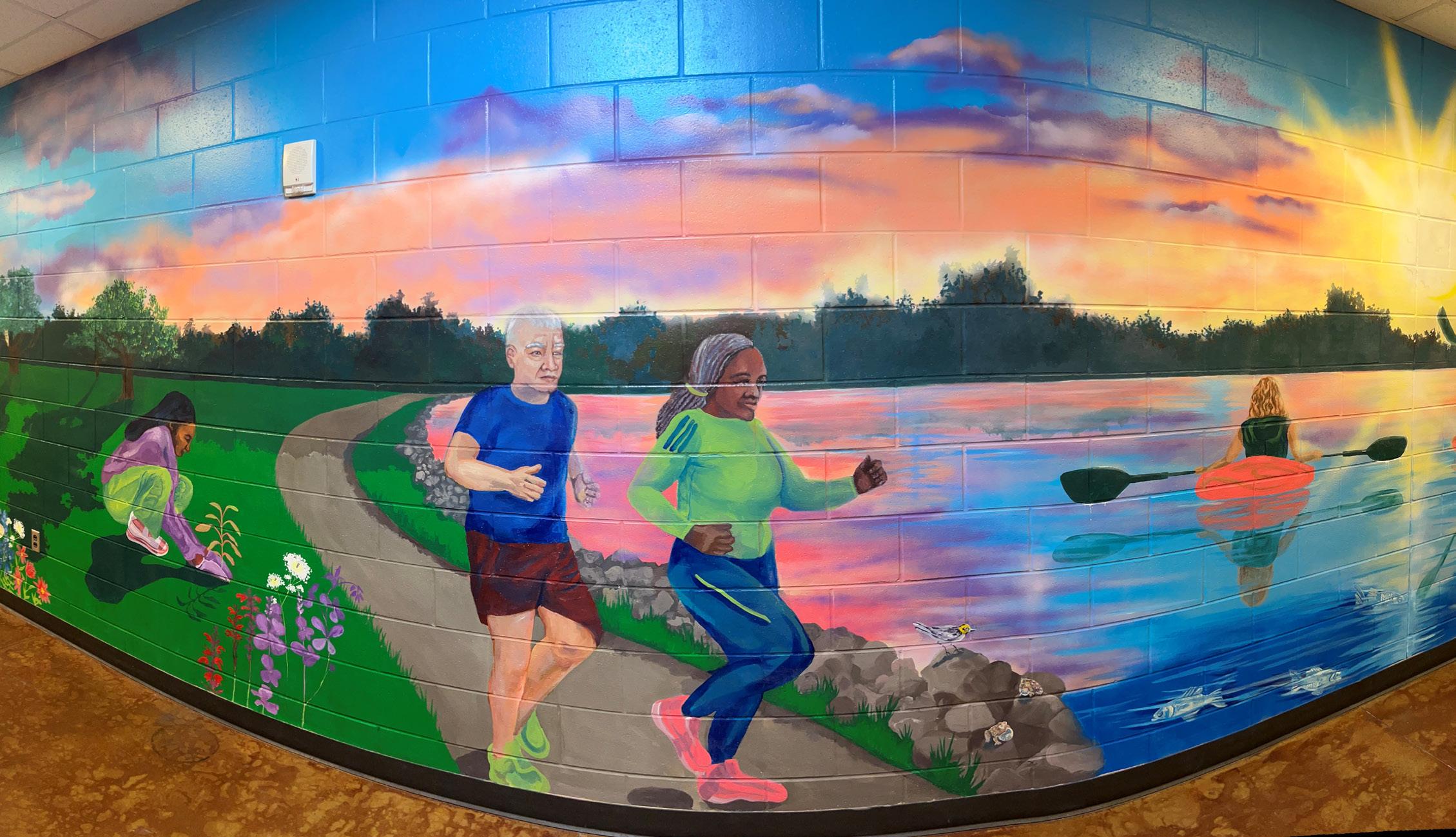 If you haven't stopped by to see the new mural at the Recreation Center, you'll definitely want to soon. This mural is a vibrant celebration of Arbor Day, featuring scenes of tree planting, kayaking, running, and more!