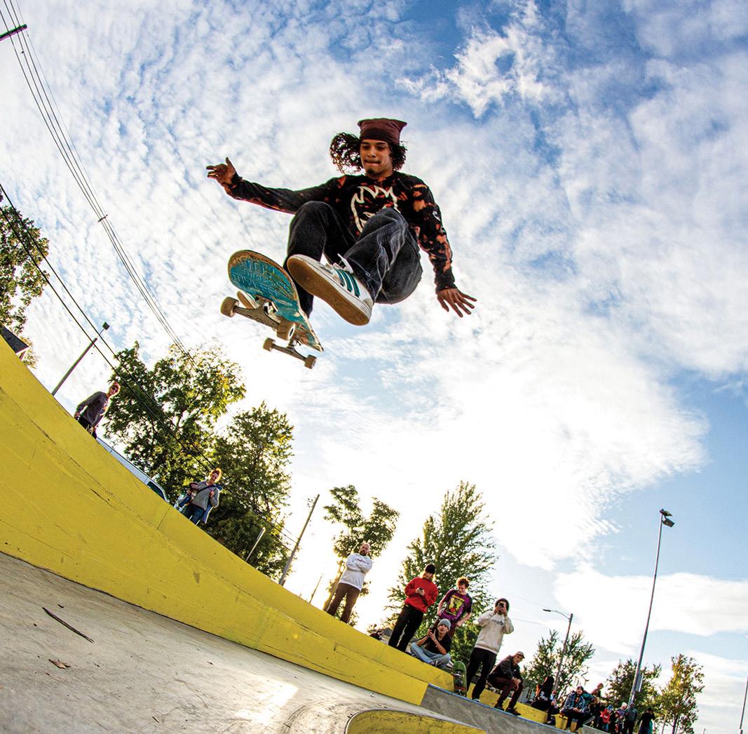 The lighted skatepark at Riverside Park offers a wide range of concrete features including rail, ledges, ramps, stairs, and launch areas for skaters of all levels.