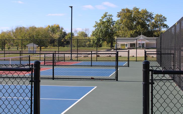 The 10-court pickleball complex at Jones Park offers plenty of space to play, with five courts on each side of a central shaded area that includes benches, electrical outlets, and a drinking fountain. Courts are separated by four-foot fencing, with an eight-foot fence around each group of five. Access the courts from Fruitland Boulevard. Pickleball is also lined on tennis courts at Noelridge, Ellis, and Bever Parks.