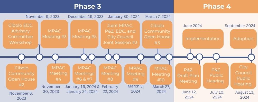 The Cibolo Tomorrow Comprehensive Plan involved a 4-phase process that lasted approximately 16 months. Each phase had significant milestones, including crucial public events. Each milestone builds upon the preceding ones, integrating community-wide feedback and input into the plan. The planning process provided a structured framework for decision-making, fostered community engagement, and ensured that development aligns with the needs and aspirations of residents. Below is the 4-phase process of the Cibolo Tomorrow Comprehensive Plan.